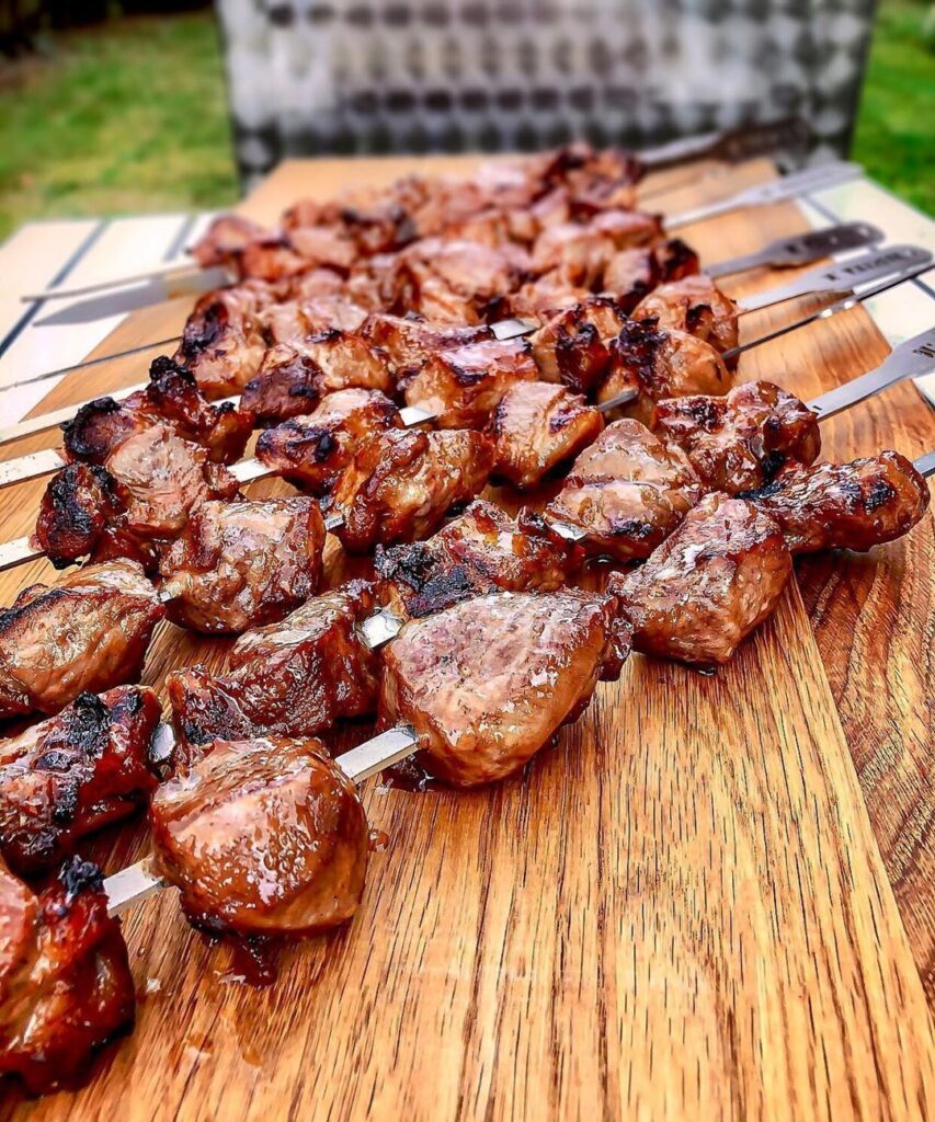 Traditional Georgian barbecue. Pieces of marinated meat (usually pork or veal) are skewered and grilled over grapevine embers, giving it a unique smoky flavor.