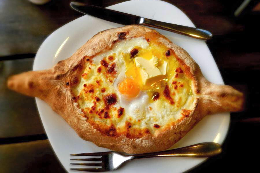 Boat-shaped leavened dough baked with a generous amount of cheese, topped with a raw egg and a chunk of butter. It is the ultimate comfort food from the Adjara region.